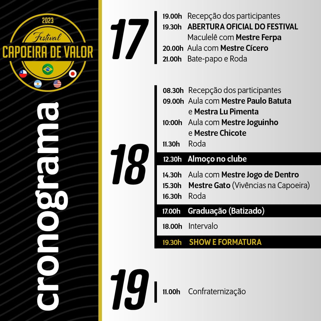 Aulas, palestras, shows vivencias e rodas com mestres detentores da Bahia e do Rio de Janeiro e de outros lugares compõem o cronograma do festival. Para participar do evento os interessados devem efetuar a inscrição e pagamento através do site www.capoeiradevalor.com ou pelas redes sociais do coletivo Capoeira de Valor.