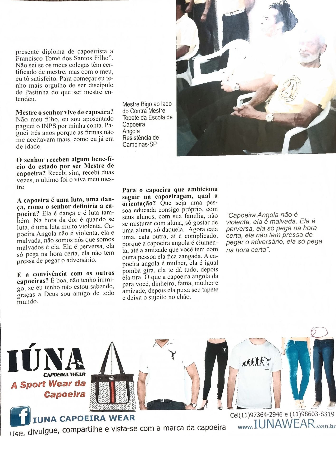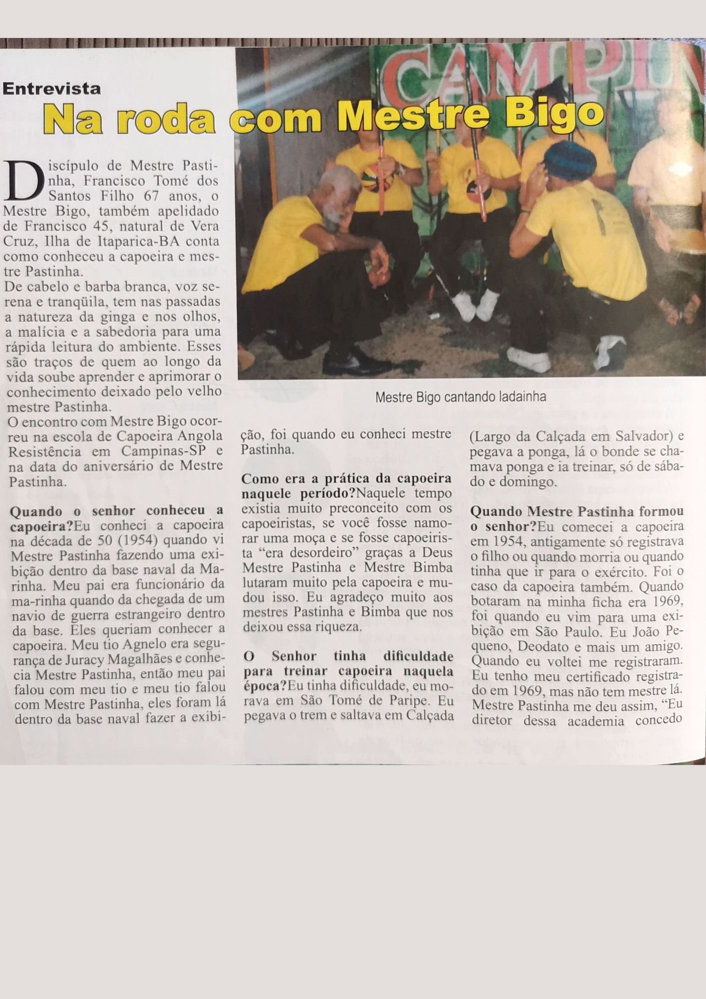 Essa conversa com Mestre Bigo foi realizada no ano de 2013 na Escola de Capoeira Angola Resistência na cidade de Campinas depois da tradicional Roda do Gueto promovido por Mestre Topete. Na ocasião, como até hoje, mestre Bigo participa e prestigia a roda e a Escola de Mestre Topete.